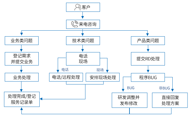 服務流程: 通過各級服務顧問,結合熱線、現場、網站等多種服務方式,完善服務接待機制,構建高效的服務響應,達成客戶滿意度。