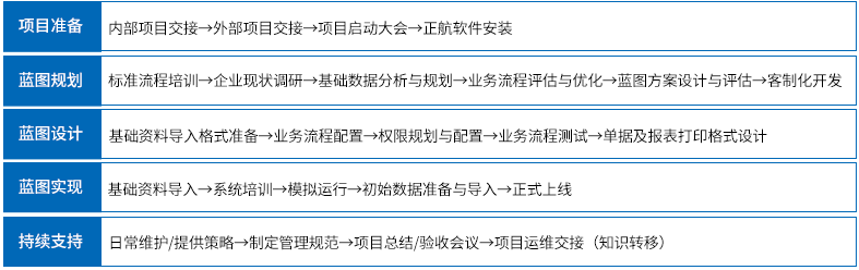 實施流程:在信息化項目實施啟動的第一天,就可以做到心中有數,清楚后續各項工作開展的順序、目標、內容等,利于用戶理解實施的全過程,加強實施雙方的協調。