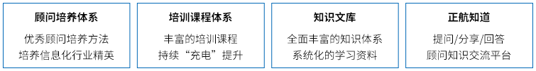 顧問認證:正航學院顧問認證是針對正航解決方案、管理咨詢、實施服務的標準認證體系,它可以搭建起用戶、合作伙伴、個人專業能力之間信任的橋梁,也是合作伙伴對顧問人員專業技能的綜合驗收,及個人職業生涯不斷晉升的重要途徑。